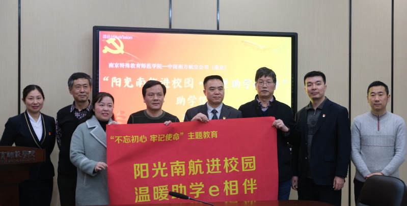 为深入贯彻习近平新时代中国特色社会主义思想,进一步开展“不忘初心、牢记使命”主题教育,我校和中国南方航空公司南京营业部于2019年12月2日下午14:00在实验实训大楼203举办“阳光南航进校园,温暖活动e相伴”助学仪式。校党委常委、纪委书记崔燕,学生工作处处长章小军,院长胡作进,党总支书记王建国,副院长张居晓和来自中国南方航空公司南京营业部总经理禤其锐等一行七人。本次仪式由党总支书记王建国主持,共分为机票捐赠仪式和参观校图书馆、校特教博物馆两个部分。