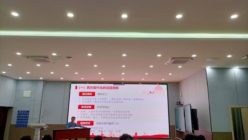 张九童院长结合党的二十大精神和习近平总书记在习近平新时代中国特色社会主义思想主题教育工作会议上的重要讲话精神,首先从西方现代化切入主题,强调中国式现代化是中国共产党领导的社会主义现代化,他聚焦主题,结合实际,从时间和空间两个维度分别阐释了中国式现代化求解面临中西古今的问题,并提出将马克思主义与中国实际、中国优秀传统文化相结合能够有效破解中国式现代化的“中西”和“古今”的难题;最后,他指出中国式现代化是历史的选择、人民的选择,呼吁在场学员埋头苦干、奋勇前行,为全面建设社会主义现代化国家、全面推动中华民族伟大复兴而奋斗。