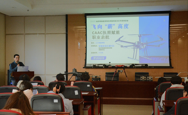 活动在热烈的掌声中正式开始,王老师以“CAAC执照赋能职业启航”为主线,生动阐述了该执照在物流配送、地理测绘、环保监测与应急救援等前沿领域的权威性与优势处。