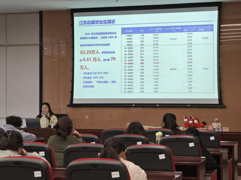 在经验分享环节,杜爽老师聚焦“考研核心抉择与择校策略”,结合江苏省就业市场动态与人工智能行业发展趋势,深度剖析了当前的竞争形势与潜在机遇。针对同学们最为关切的择校难题,杜爽老师从院校排名、报录比、分数线及地域资源等维度进行了拆解分析,特别强调了导师研究方向与培养风格的关键作用,勉励同学们要避开盲目跟风的误区,结合自身实际理性规划,做到精准发力。